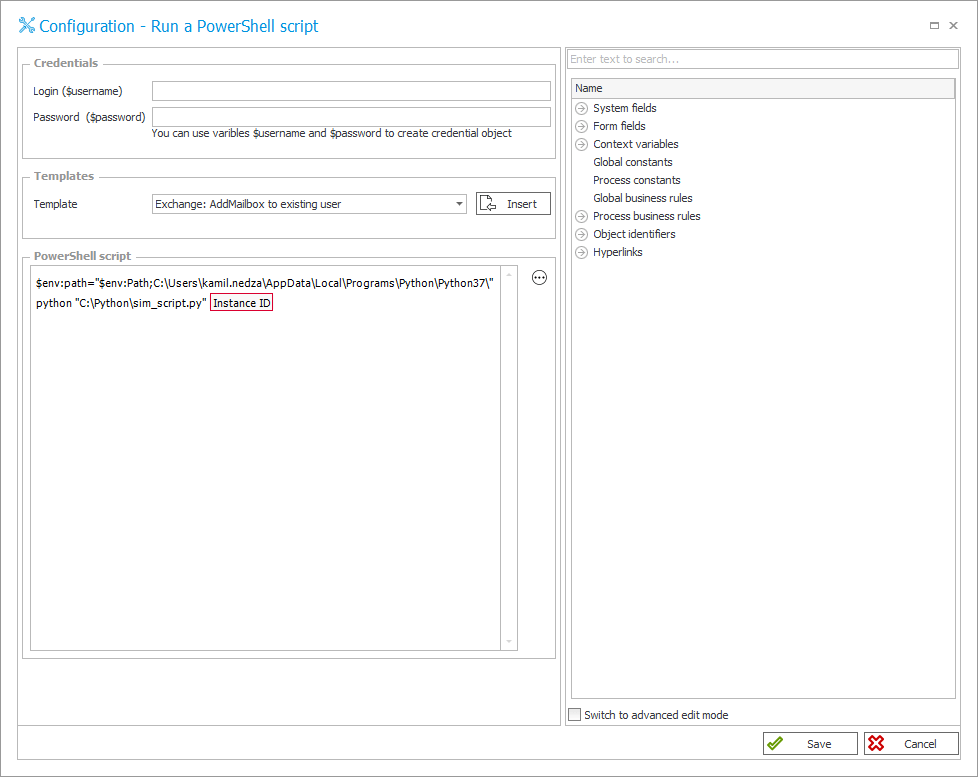 The script written in python worked like a charm. Unfortunately, I had to execute it manually. I quickly concluded that using it this way is uncomfortable and really frustrating. Despite the fact that I have basic programming knowledge, I don’t know yet how to create SDK add-ons for WEBCON BPS. Of course, I hope that soon I will be able to make up for these shortcomings. Also, I am not sure if the express version license allows the use of the SDK. So in the first place, I was looking for other solutions that do not require SDK. I decided to try using PowerShell action.